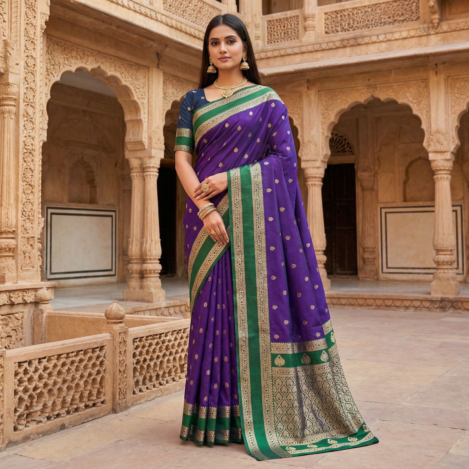 Saree :- gold zari butta motifs scattered gracefully across the body. The  pallu heavy zari weaving with classic paisley and floral motifs.