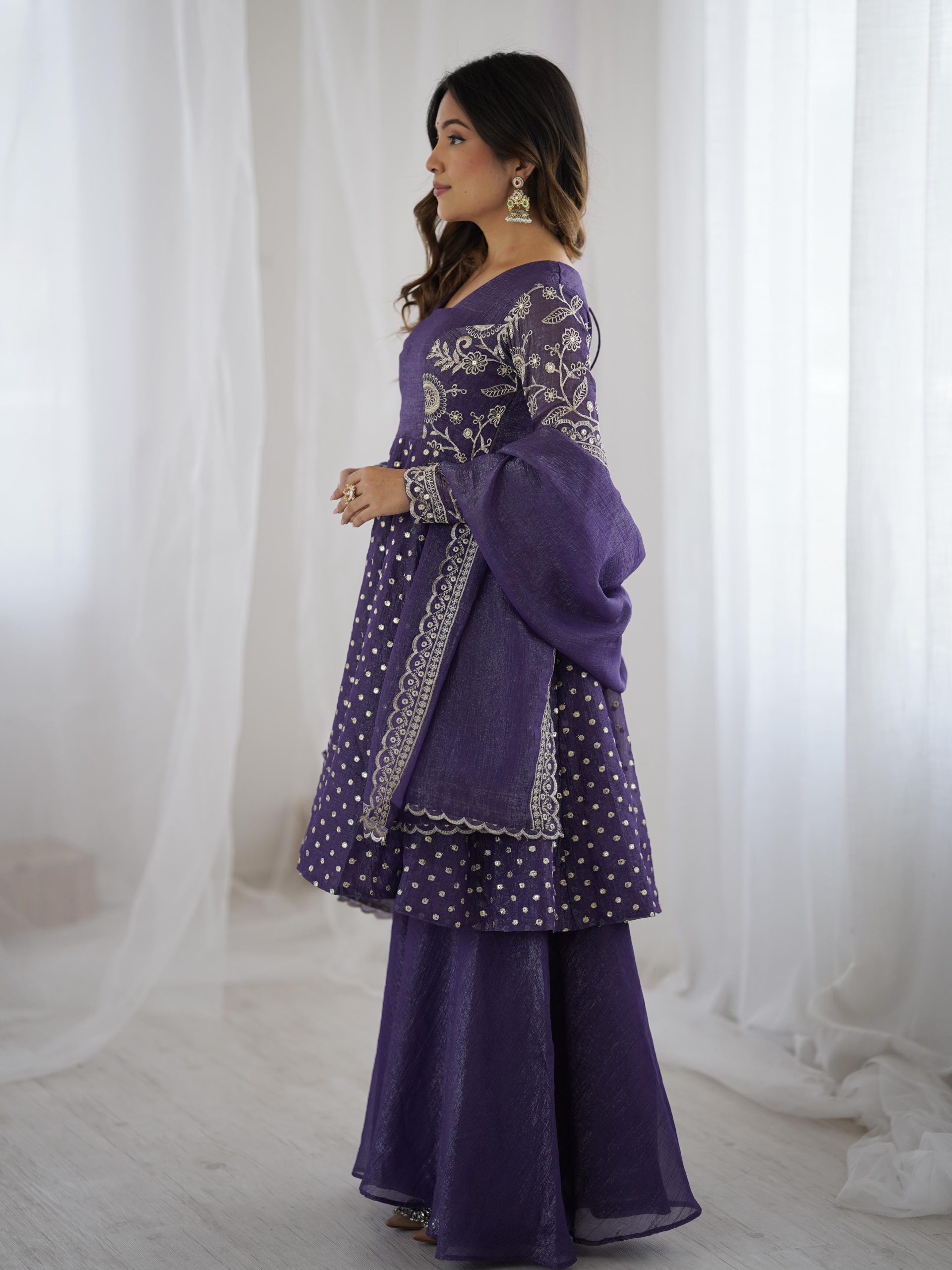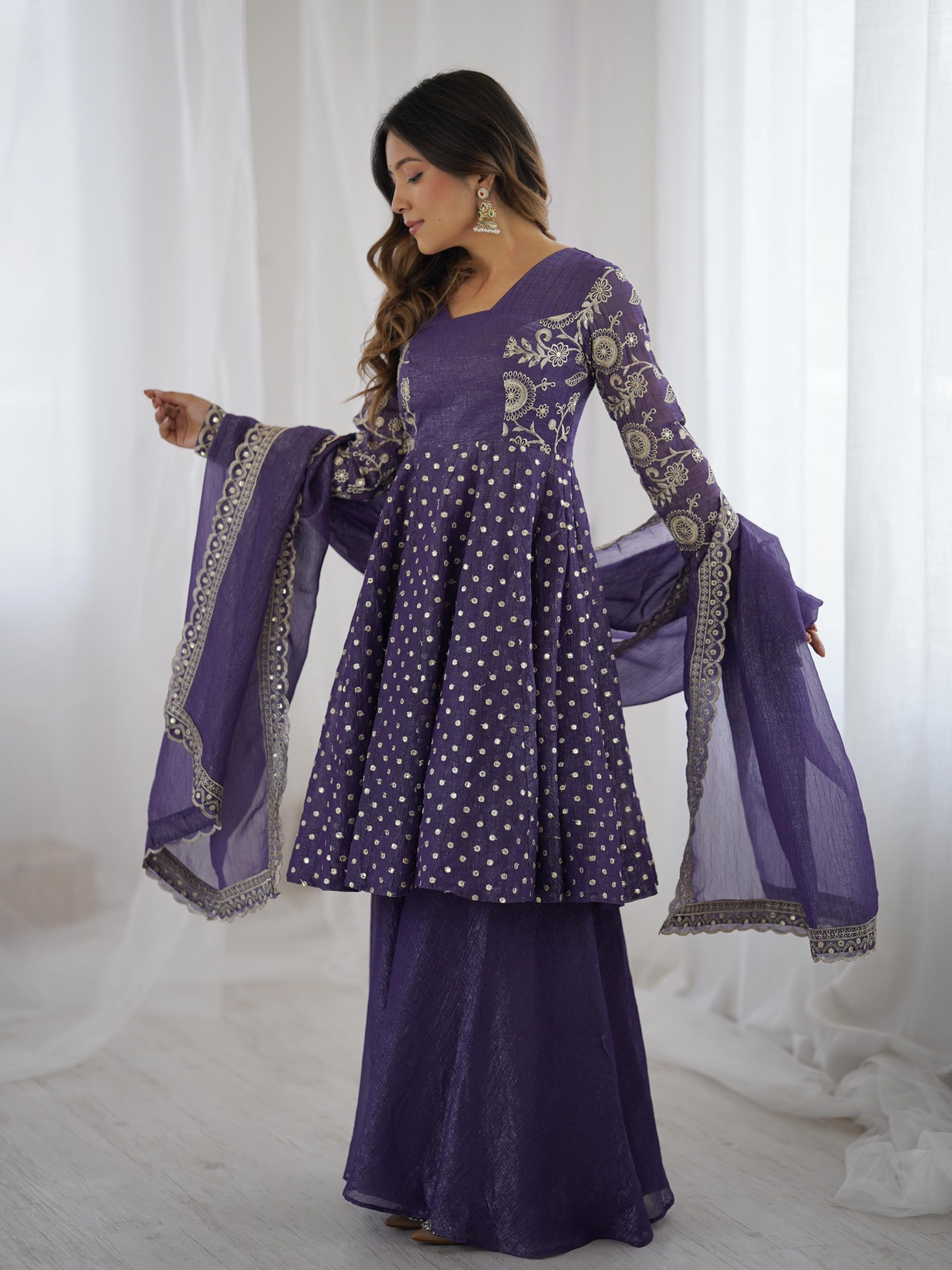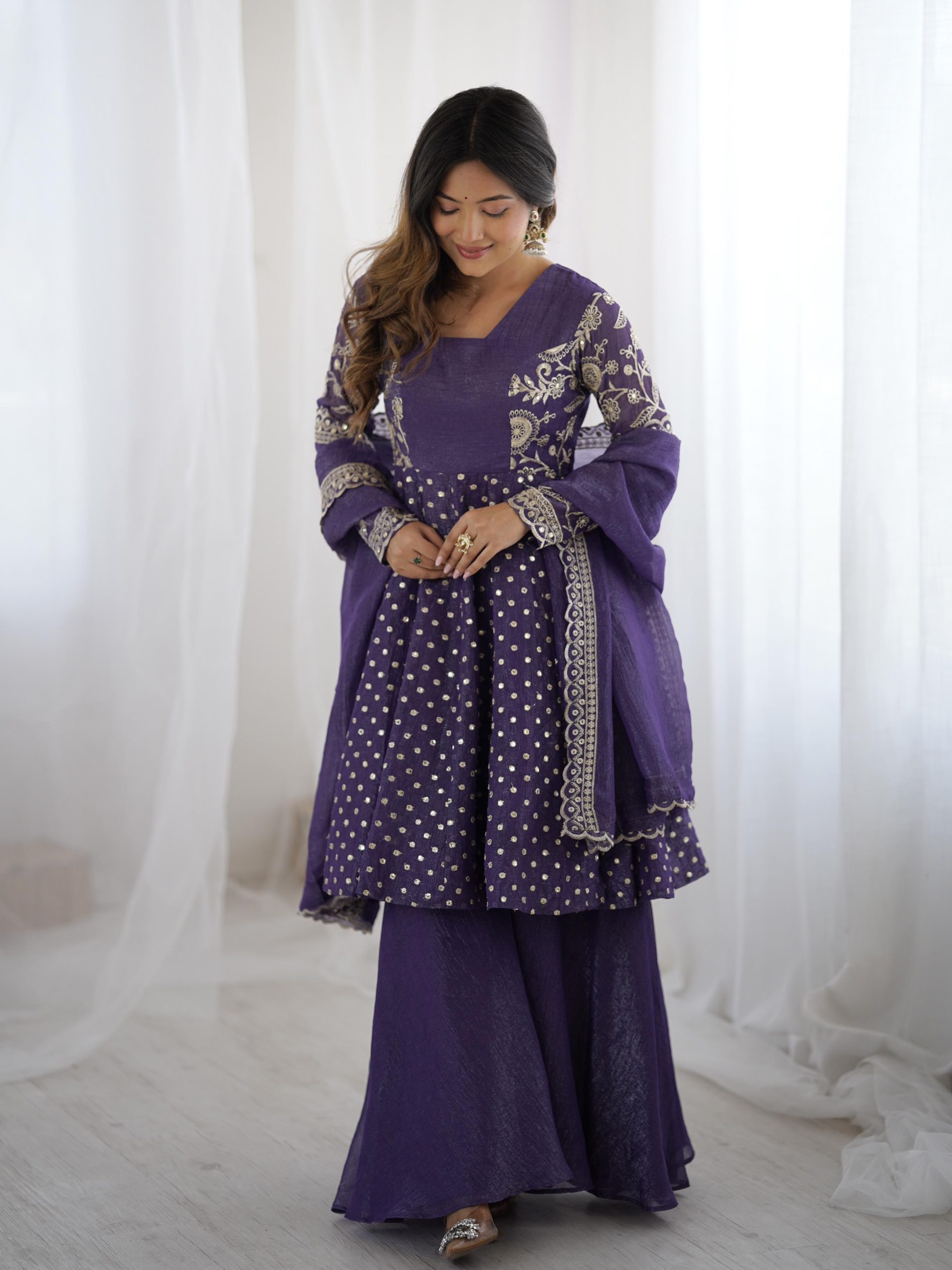 Top: Fabric: Crunchy Silk Design: Embroidery Sequence Work Sleeves: Full Inner: Heavy Micro Cotton Length: 38 Inches Sizes : Free Size Semi Stitched Bottom (Sharara Palazzo): Fabric: Crunchy Silk + Full Flair Length: 40-41 Inches Dupatta: Fabric: Crunchy Silk Design: Embroidery Sequence Work |