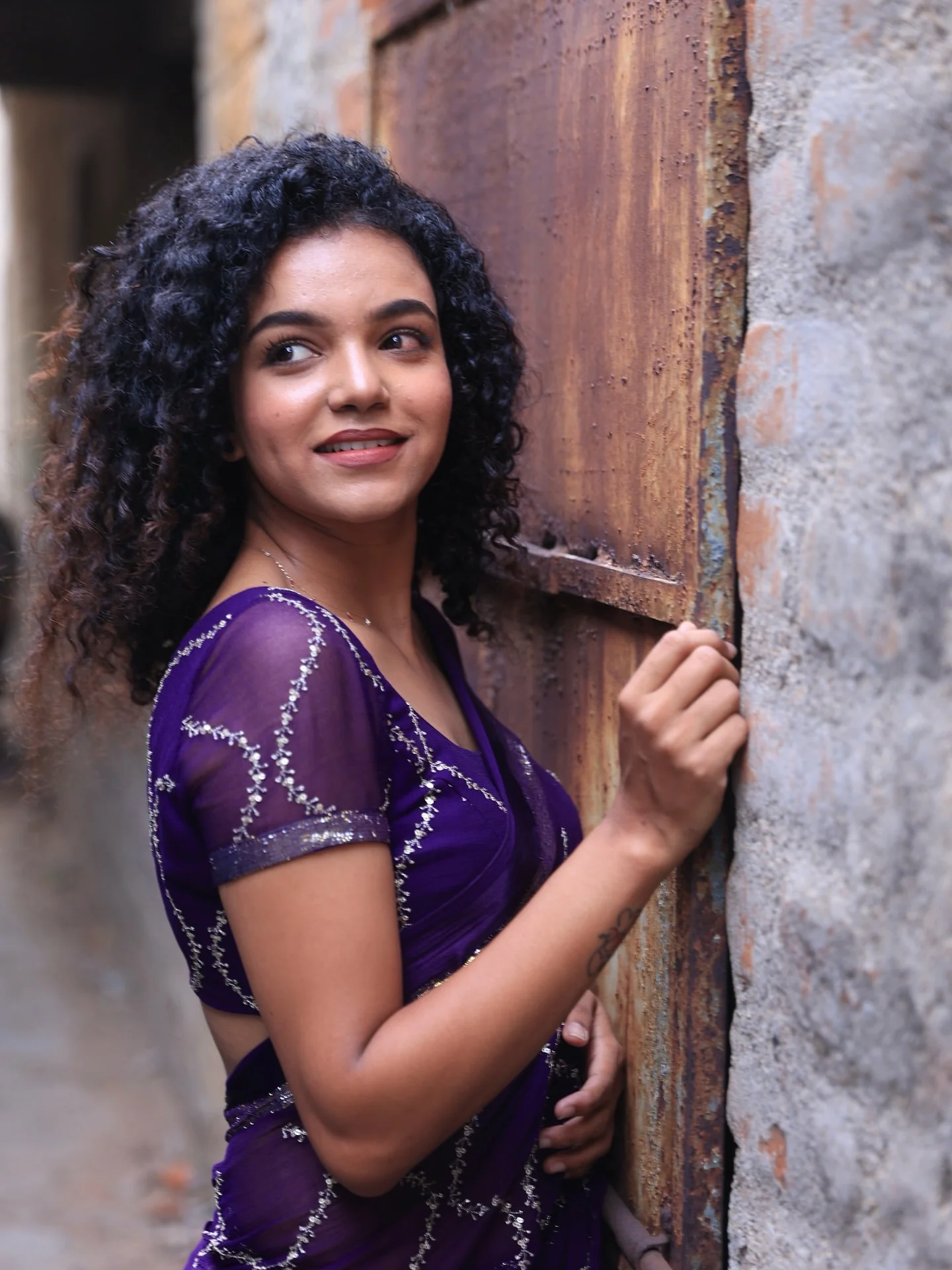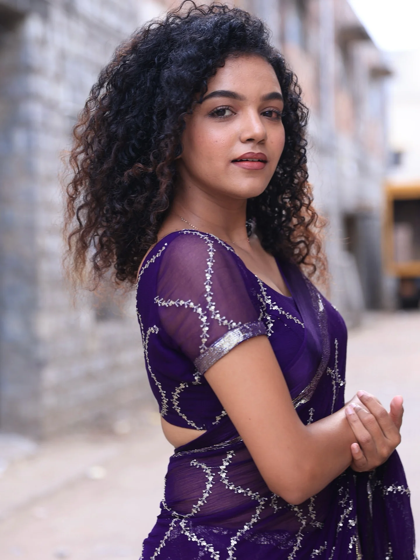 Purple Viscose Satin Sequin Embroidery Work Saree