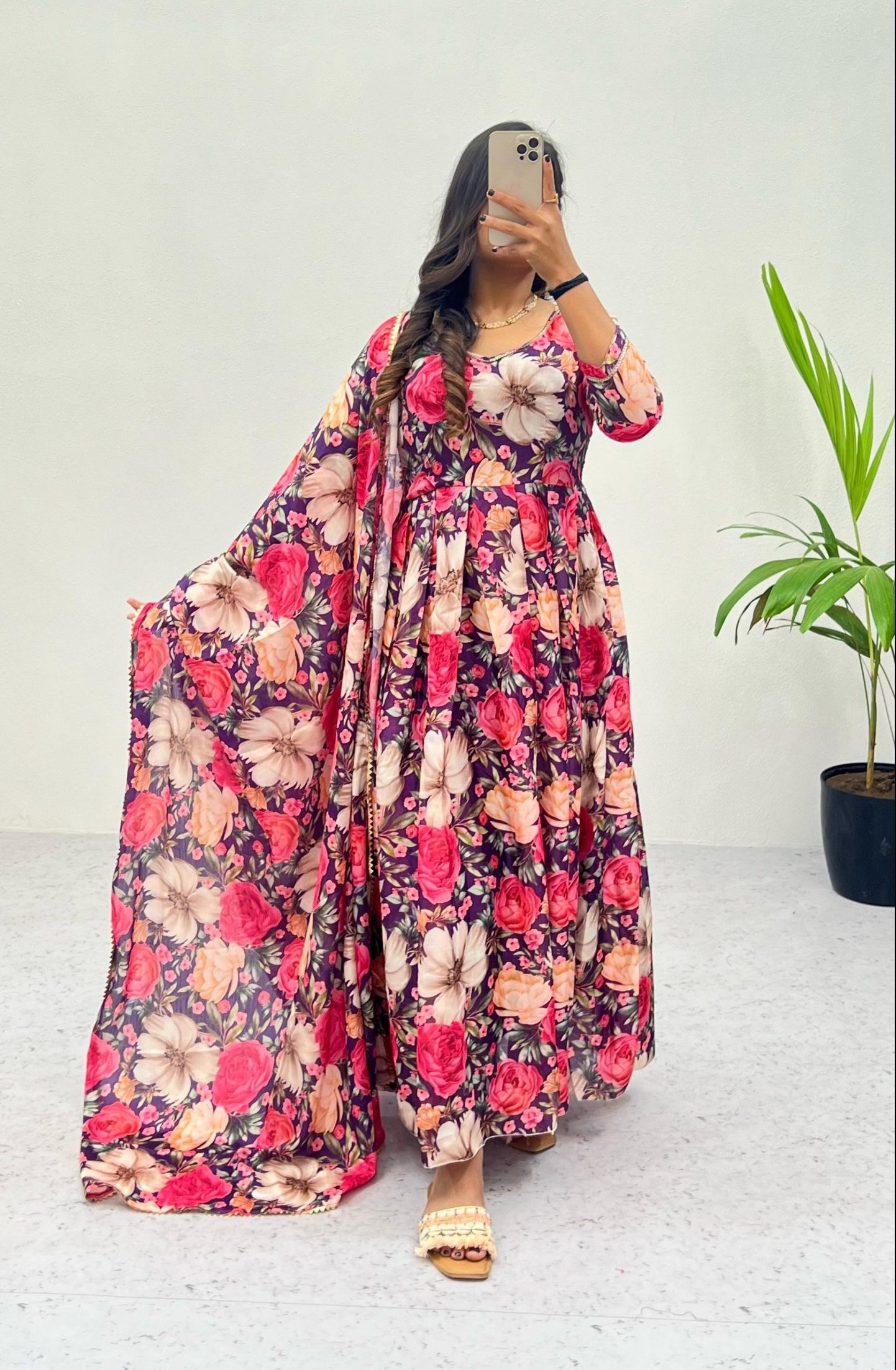ย Fabricsย | Gown Fabric :Heavy Chinon Gown Length : 52 Inches Inner :Silk Work :Print with Lacework Size :: Free Size Type : Full-Stitched Sleeves : 18 Inches Gown Flair : 4 M Dupatta Fabric :Heavy Chinon Dupatta Work : Printed withย Lace border Dupatta Length : 2.20 MTR |
