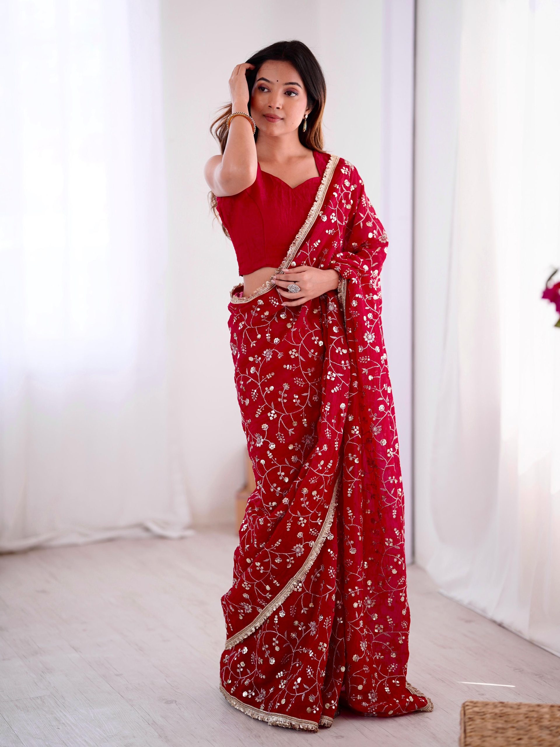 Red Crunchy Silk Embroidery Work Saree
