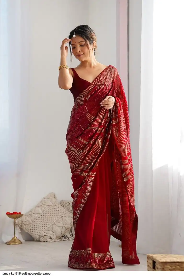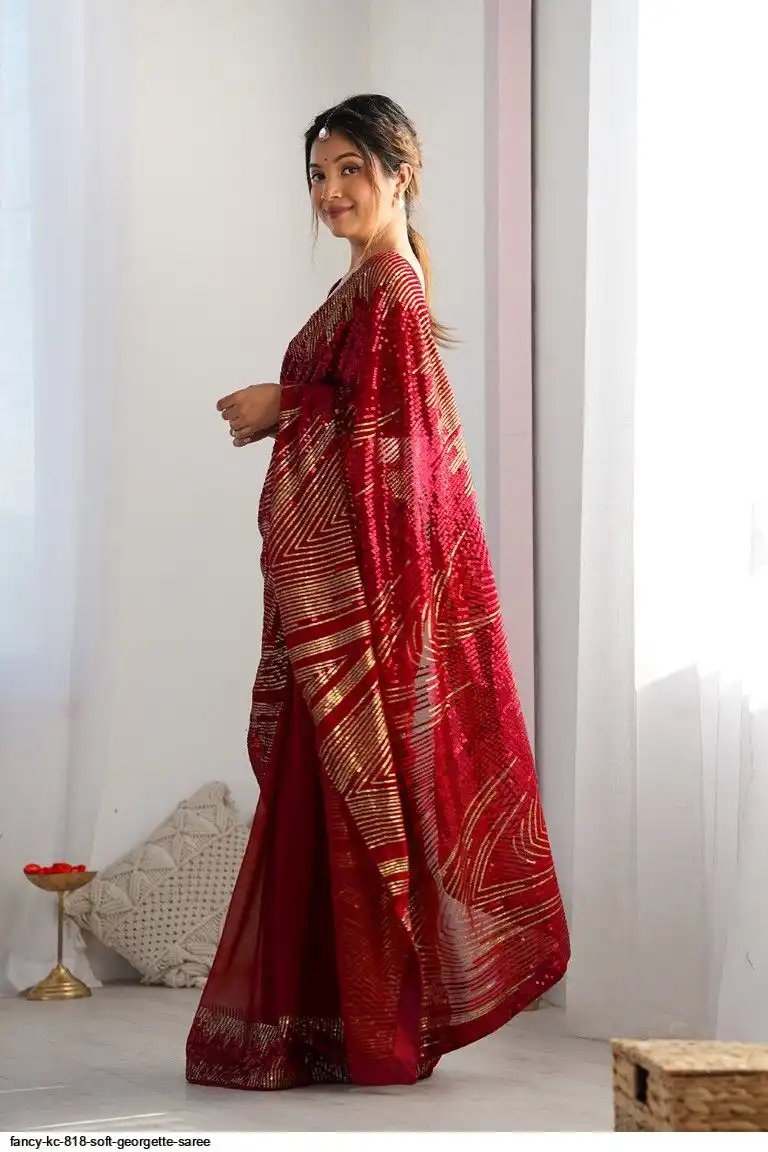 Red Georgette Sequence Lace Work Saree