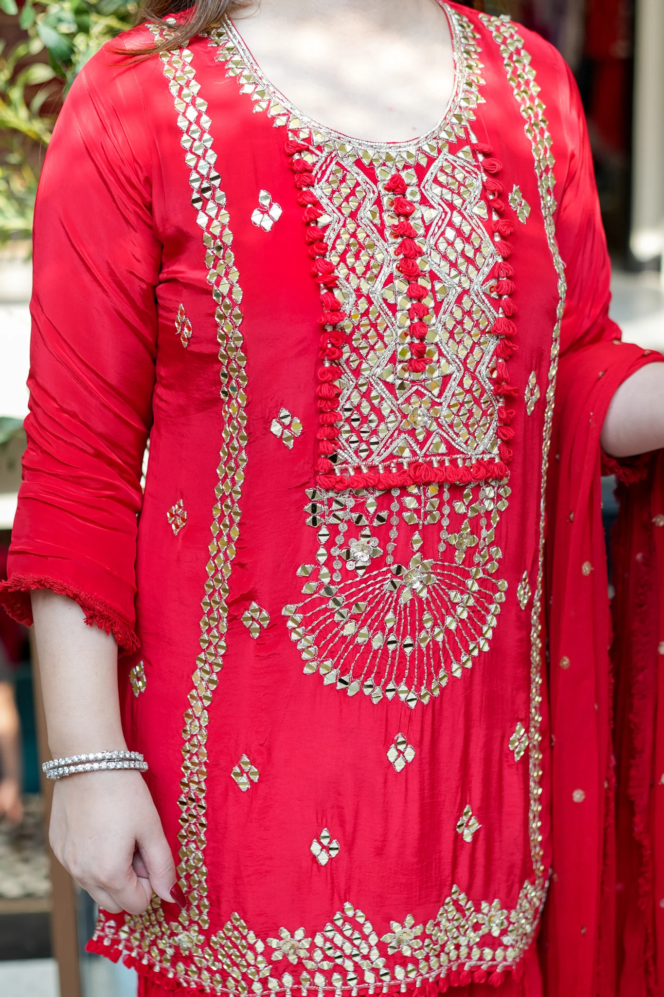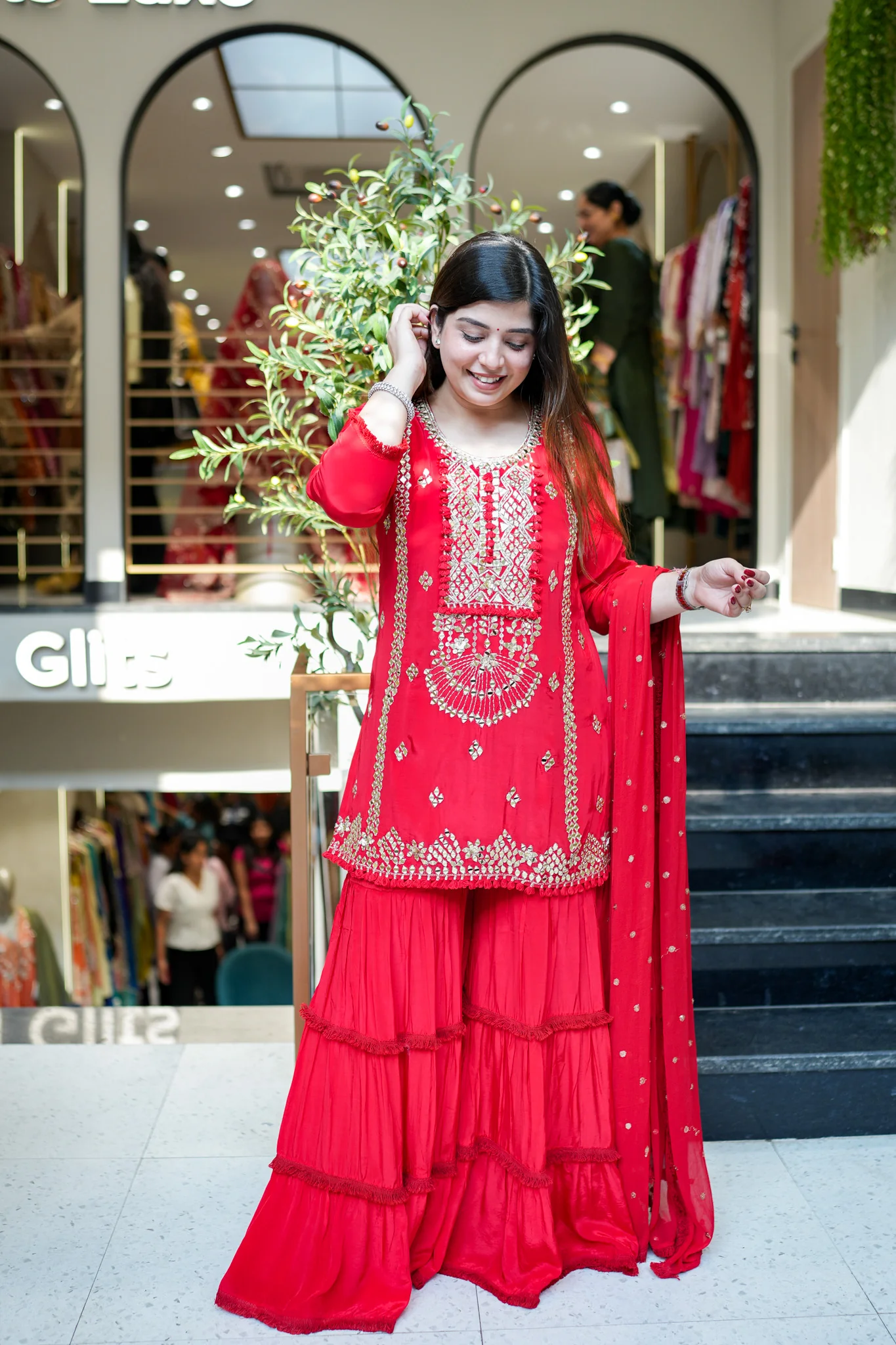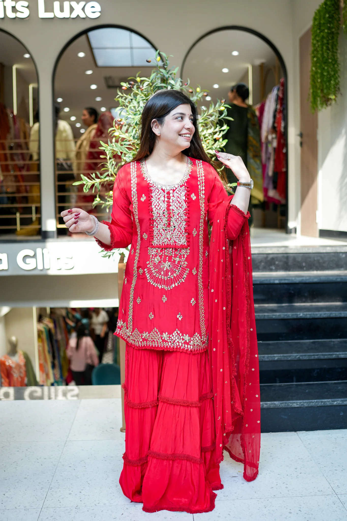 Red Vichitra Silk Thread Embroider Work Lehenga Choli