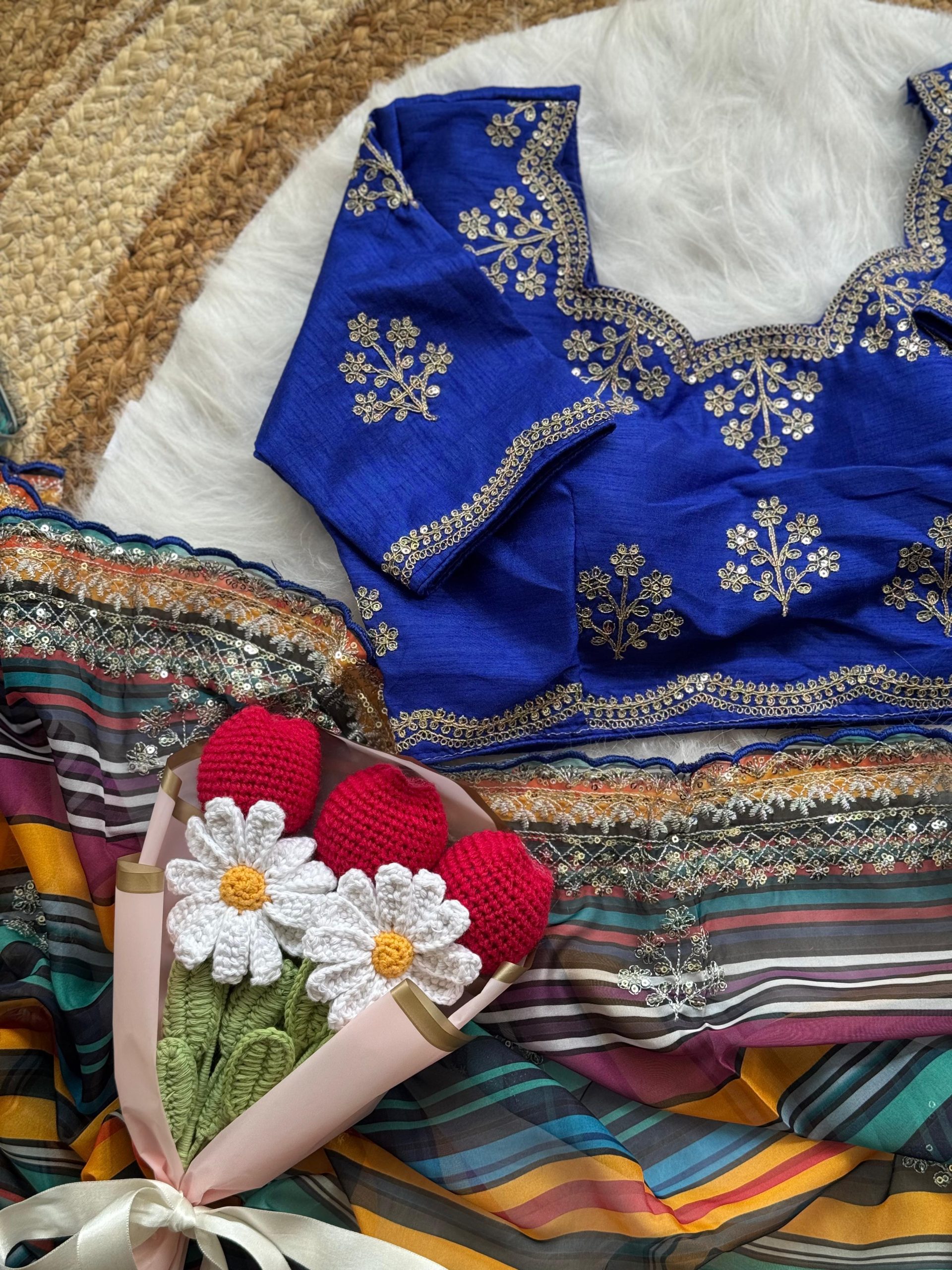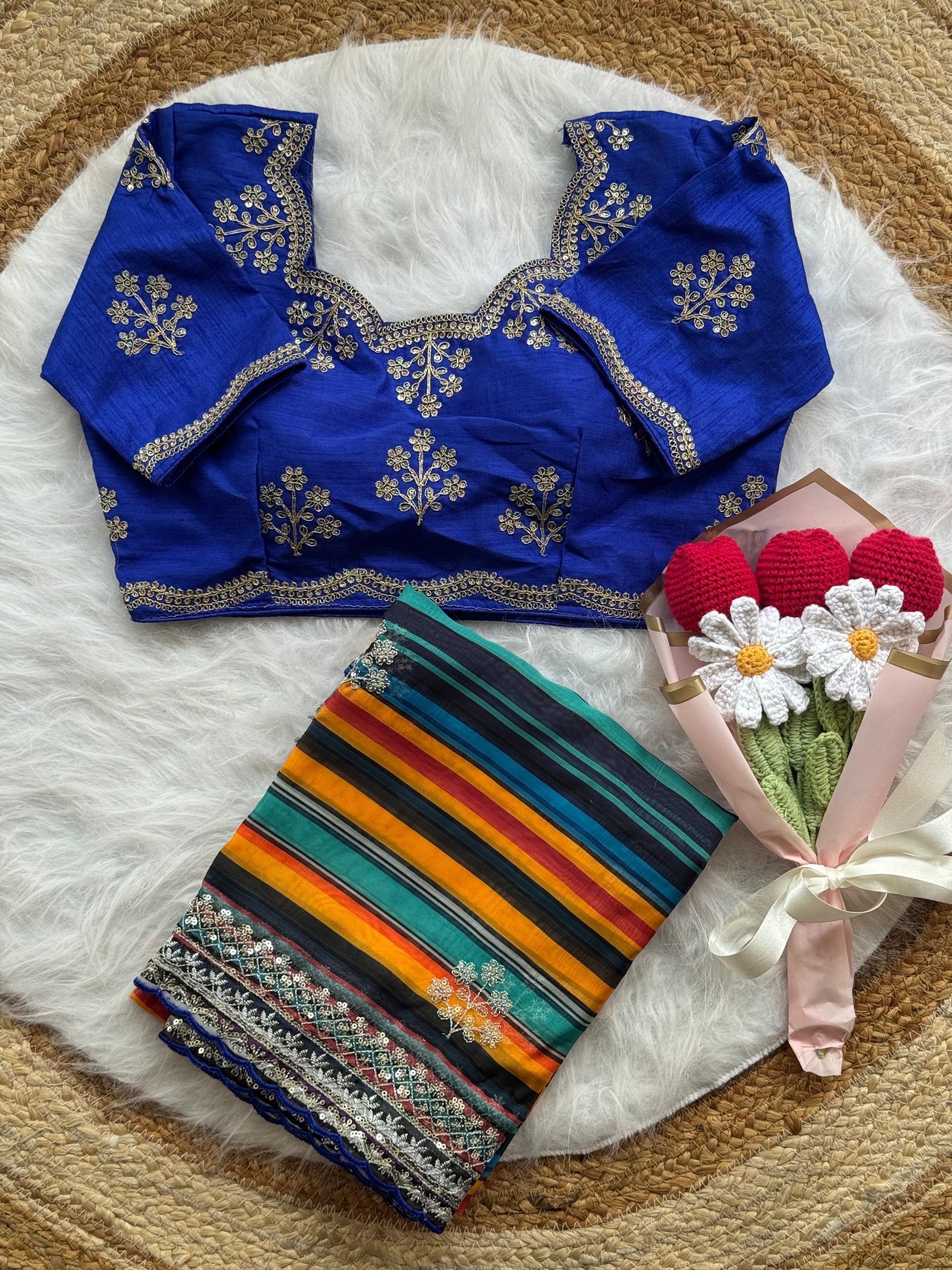 Royal Blue Soft Organza Embroidery Work Lace Saree