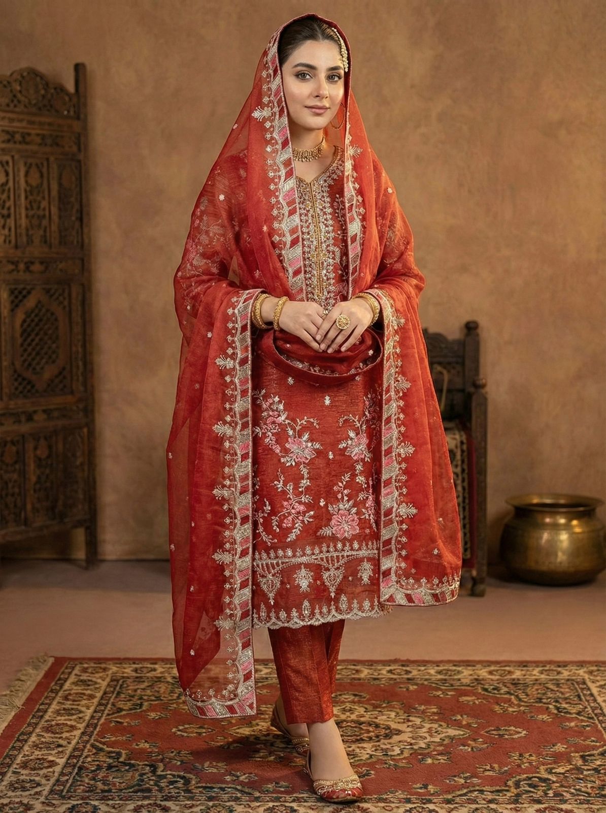 Rust Crunchy Silk Embroidery Lace Work Salwar Suit