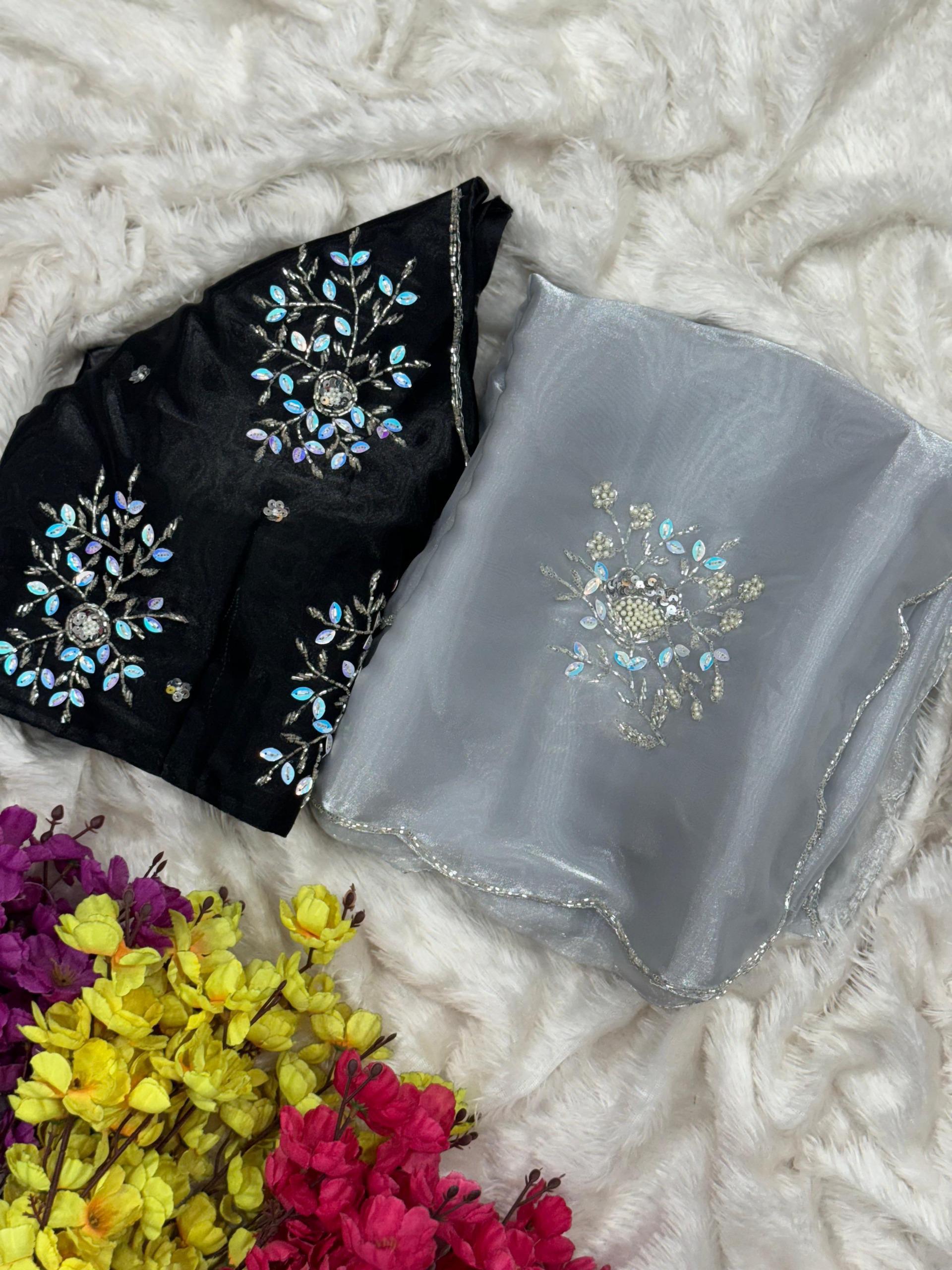 Saree Work : Heavy Handwork Butta All Over Saree Moti, Sequence And Cut Dana Attached With Two Layer Of Cut Dana And Ar co Border Blouse : Jimmy Chuu Blouse Work : Designer Handwork On Front And Sleeves Blouse : Fully Stitched |