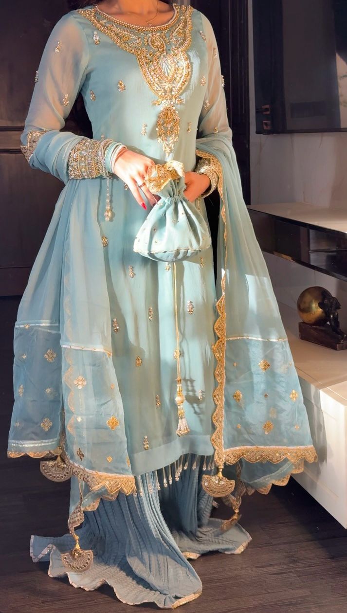 Fabrics | Top Fabric : Heavy Faux Georgette With Heavy Embroidery Sequence Work With Beads Work With Full Sleeve Top Inner : Heavy Micro Cotton Palazzo Fabrics : Heavy Faux Georgette With Crease And Lace Border With Elastic Dupatta Fabric : Heavy Faux Georgette With Embroidery Sequence Work With Lace Border |