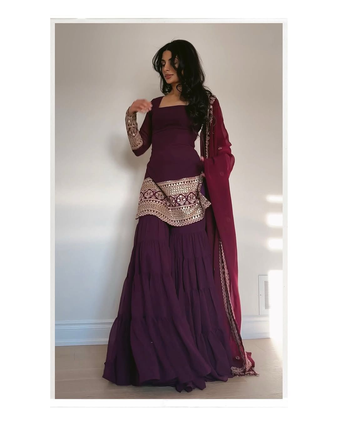 Fabrics | Top Fabric : Foix Georgette Inner : Micro Work. : thread with 9mmSequnce Stich. : Free Size Semi StitchedSharara Fabric :- Foix Georgette Work. :- thread with 9mm Sequence Stich :- Full stich up to 44 with elastic Dupatta Fabric : Foix Georgette |