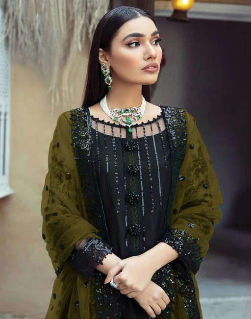 Fabrics | Top :Fox Georgette With Embroidery work Sleeves :-Fox Georgette With Emb.work + Stone Inner :- Santoon Bottom :- Santoon work patch Dupatta :- Najmeen with multi work & Four side Lace Length :- Max up to 48 |