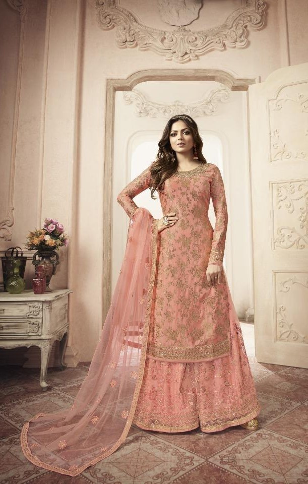 Special Peach Color Jacquard Silk Georgette Diamond Sharara Suit
