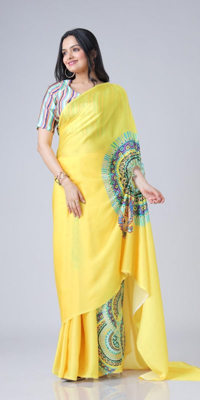 Stylist Yellow Color Japan Satin Digital Print Work Saree