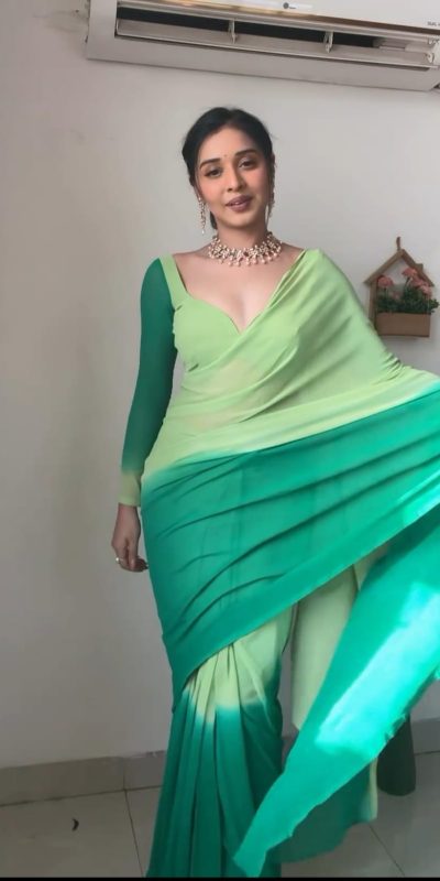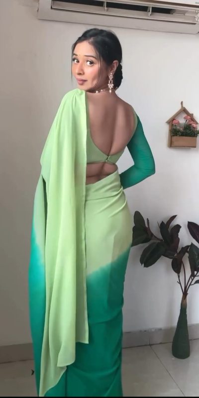 Fabrics Saree Fabric :pure soft Georgette silk Saree Work : All over the body Ready To Wear saree pista and green color  combination Saree : 5.5 Mtr Blouse Fabric : multicolor Blouse piece Blouse: 0.80 CMtr Ready To Wear saree