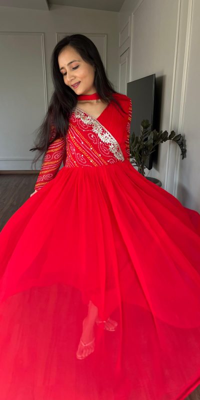 63 reviews for Red Bandhej Fox Georgette Sequence Embroidery Work Anarkali Gown