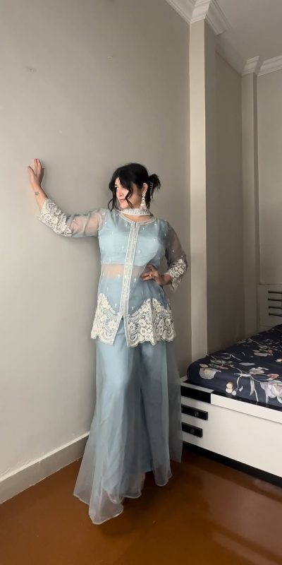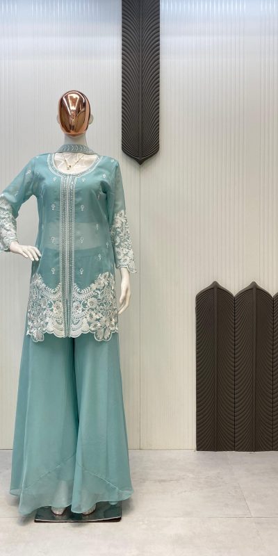 Superb Sky Blue Color Organza Sequence Work Indo-Western Suit