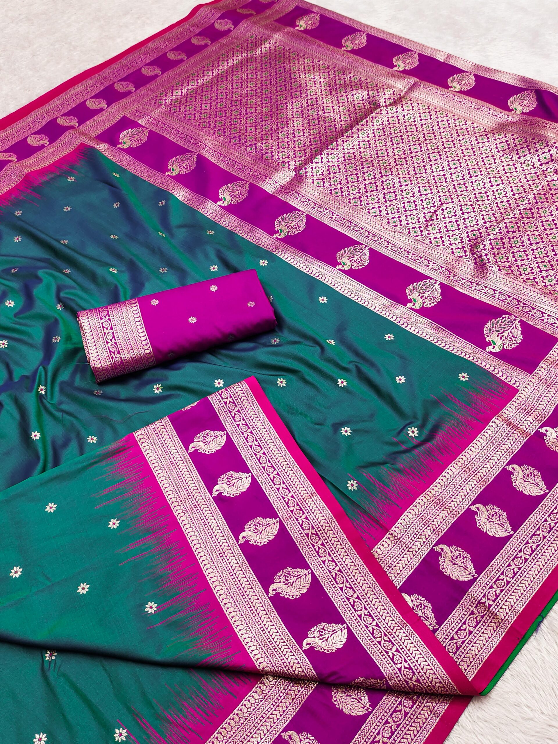 rich body adorned with zari butti weaving all over. The saree is highlighted with a contrast Banarasi border woven with traditional paisley motifs in rich gold zari And Comes with a grand Meenakari woven pallu.