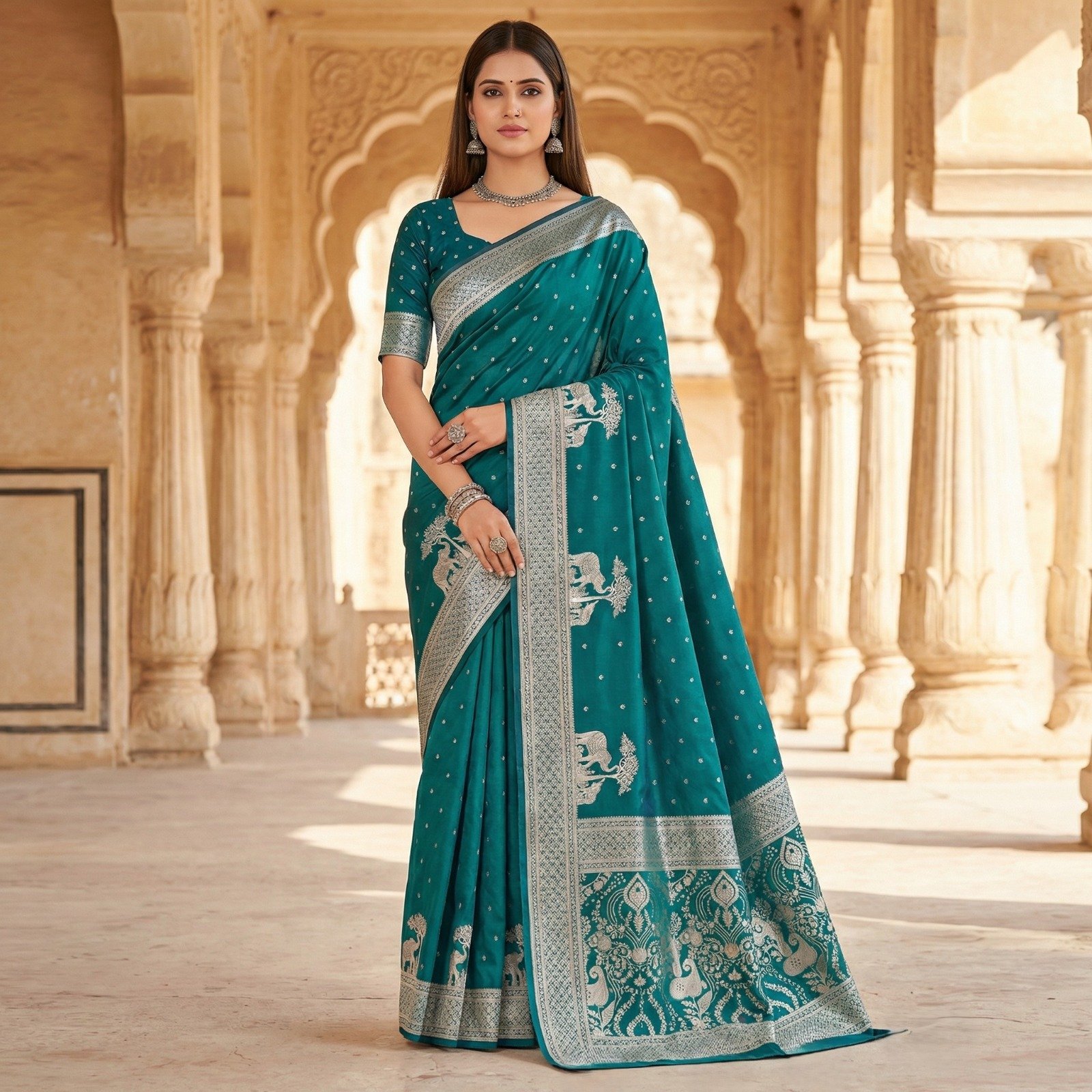 Blouse :- Matching soft pure silk weaving blouse piece with subtle zari motifs and a coordinated rich border for a complete graceful look.