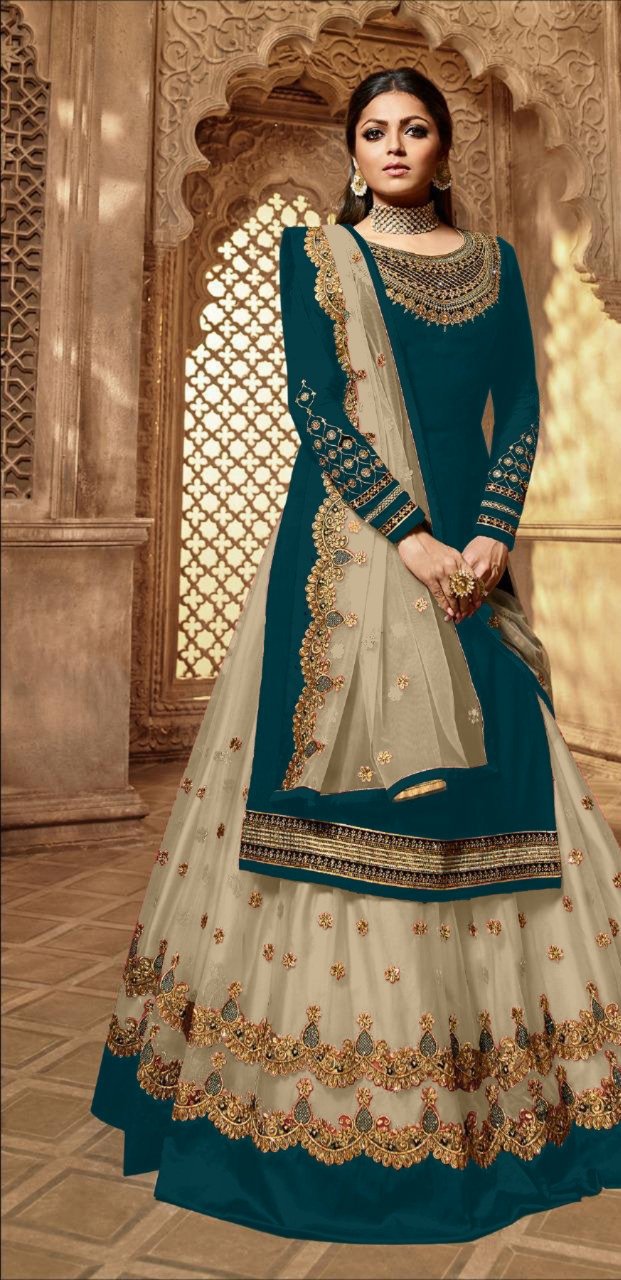 Top :- Heavy satin Georgette with Embroidery .Work Sleeves :- Heavy satin Georgette With Embroidery Work Stone Inner :- Santoon Lehenga :- Heavy Net Santoon Bottom:- Heavy Santoon Dupatta :-Net Georgette With Embroidery.Work |