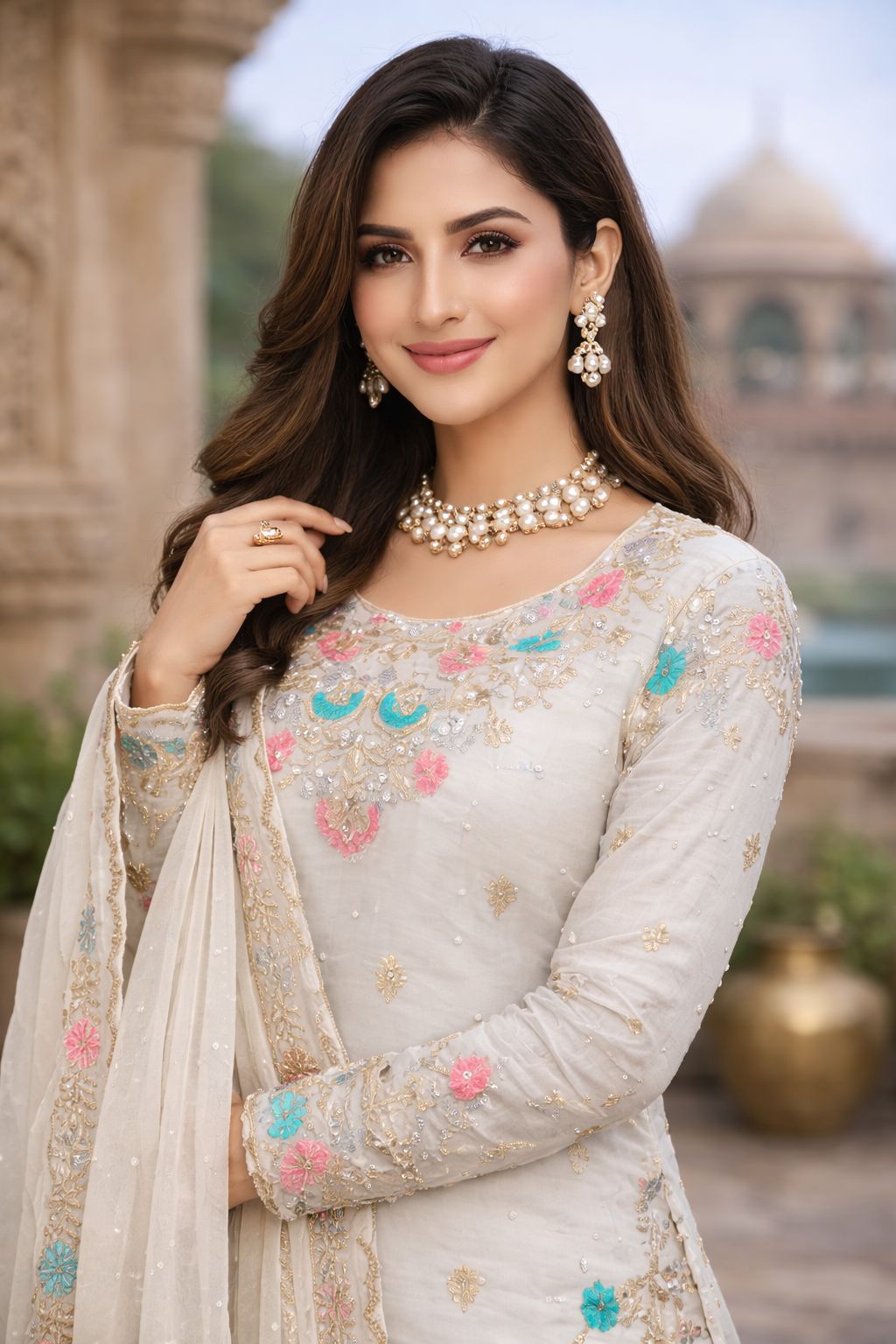 White Organza Silk Sequence Moti Work Salwar Suit
