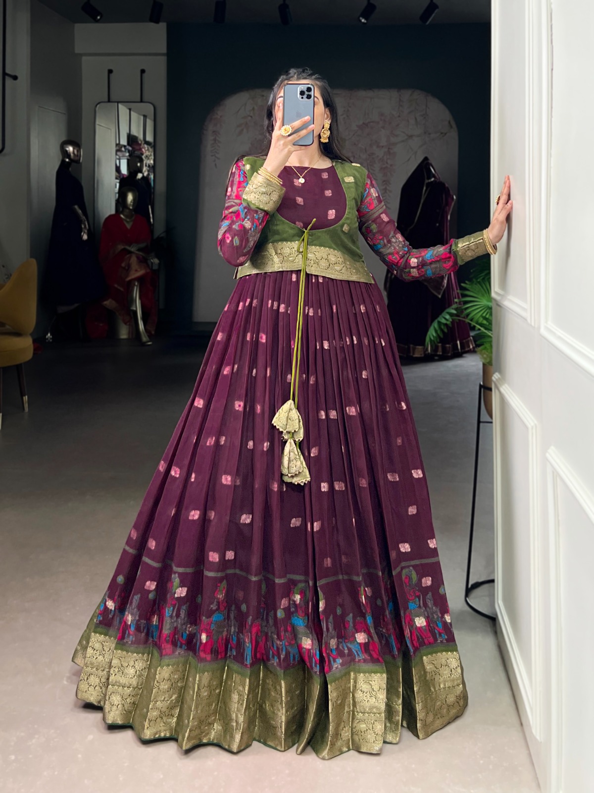 Gown Gown Fabric : Poly Cotton Gown Work : Kalamkari Print With Zari Weaving Work Border Gown Chest Size : 40″ (Inside 2 inch extra margin available so you can adjust support up to 42 for your body comfort ) Gown Waist Size : 38 “ Gown Shoulder :15 “ Gown Length : 56″ Sleeve Length : 24″ Gown Flair : 4 Meter Gown Lining : Micro Cotton Koti Koti Fabric : Poly Cotton Koti Work : Zari Weaving Work Koti Chest Size : 40″ (Inside 2 inch extra margin available so you can adjust support up to 42 for your body comfort ) Koti Length : 15″ |