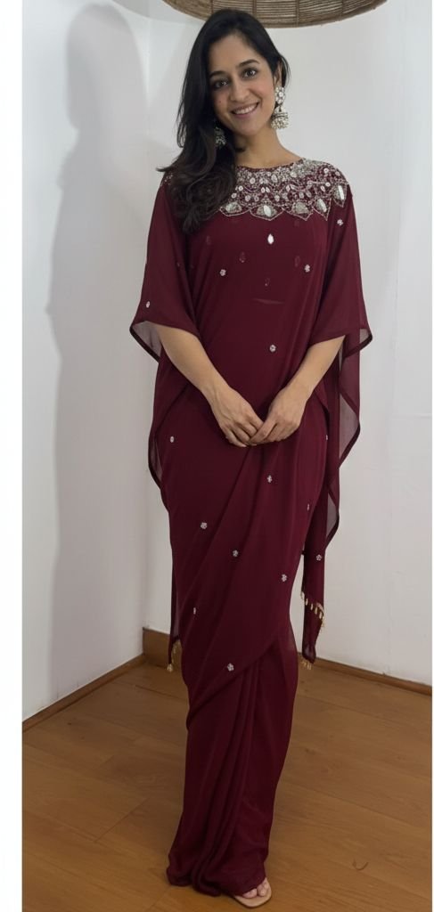 Wine Faux Georgette Mirror Embroidery Work Saree