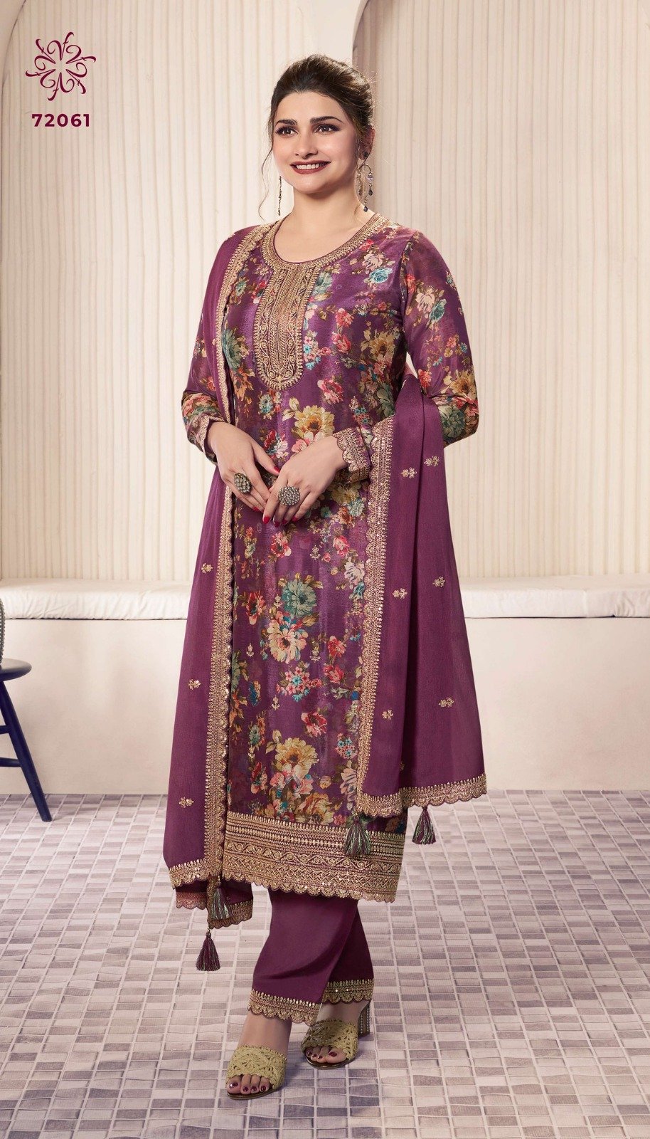 Top :- Heavy Vichitra digital print embroidery sequence + coding Top :-size:-56+ inner:-Santoon Sleeves :- Heavy Vichitra