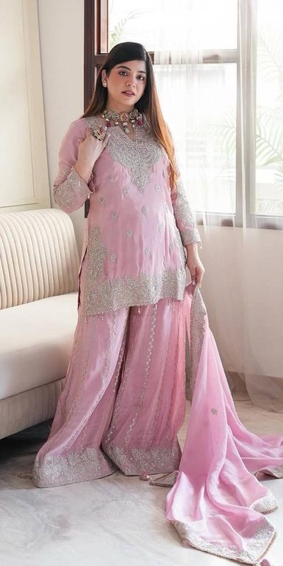 | Fabrics | Top Fabric : Heavy Chinon Silk With Heavy Embroidery Sequence Work with Rivet Moti Work*with Full Sleeve Top Inner : Heavy Micro Cotton Top Length : 38-39 Inch Top Size : Free Size Semi Stitched (Fully Stitched) (FULLY STITCHED READY TO WEAR)Gharara Fabrics : Heavy Chinon Silk With Heavy Embroidery Sequence Work with Rivet Moti Work* Gharara inner : Heavy Micro Cotton (Full stitched) Gharara Length:40-41 Inch Dupatta Fabric : Heavy Chinon Silk With Heavy Embroidery Sequence Work and Lace Border |