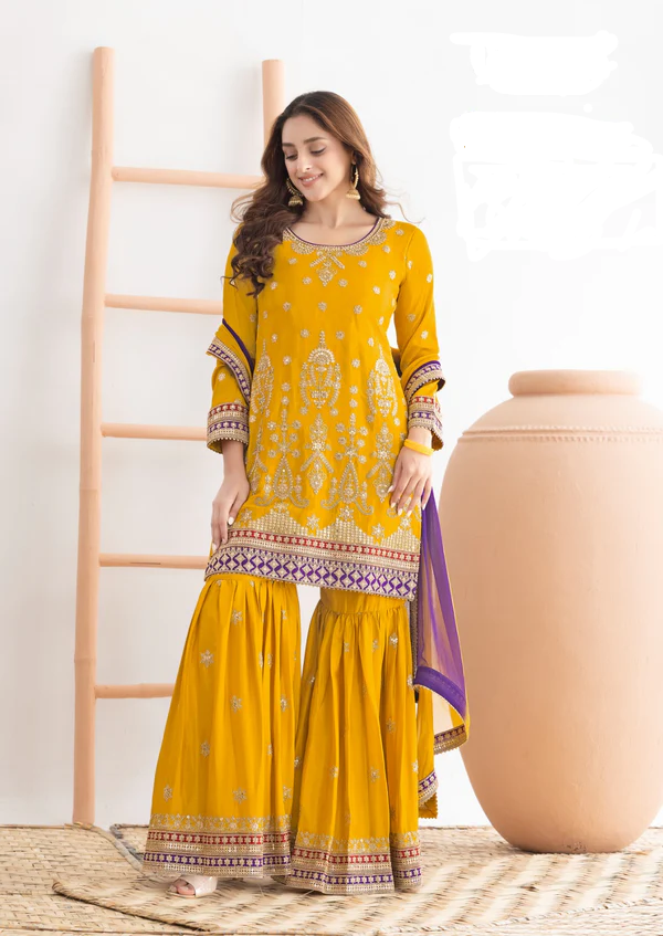 Yellow Chinon Embroidery Mirror Work Salwar Suit